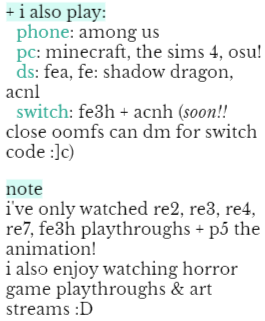 hobbies bullet journaling, gaming, listening to music, doodling, editing, making carrds, anime & manga, watching gameplays/streamers<3 my friends :D, mystery/horror, webtoons, memes, shibes, hugs, buzzfeed unsolved, hoodies, looking at the sky</3 negativity, discrimination of any kind!!!, seafood, the heat, lots of schoolwork, not enough time, insects aaahhh wtf, the pain i am always inalso, yes. i am willing to share my five star venti with you; we both have joint custody of him. ily you'll get him soon i promise